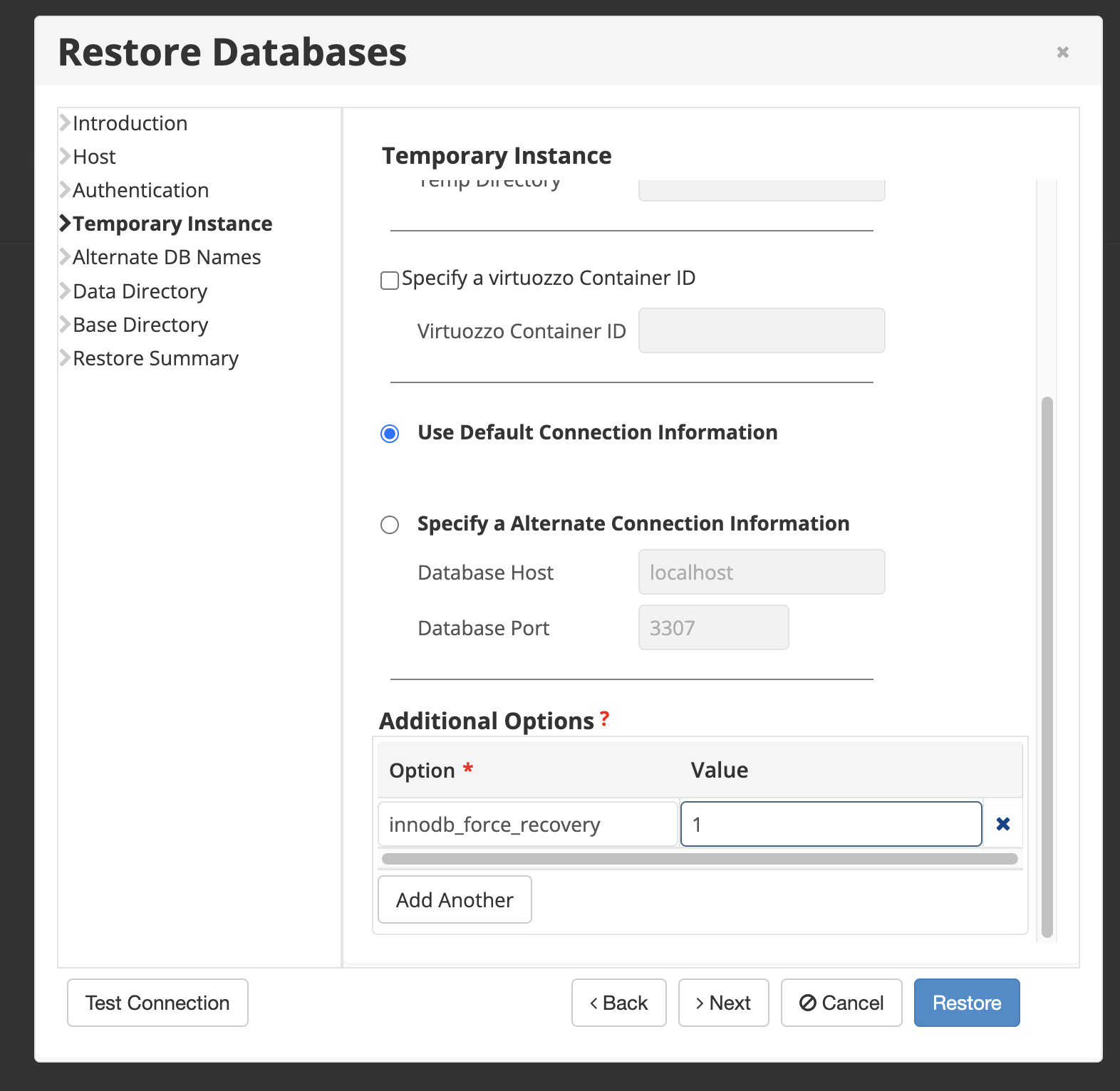 - При восстановлении базы данных выберите "innodb_force_recovery 1" или "innodb_force_recovery 2"