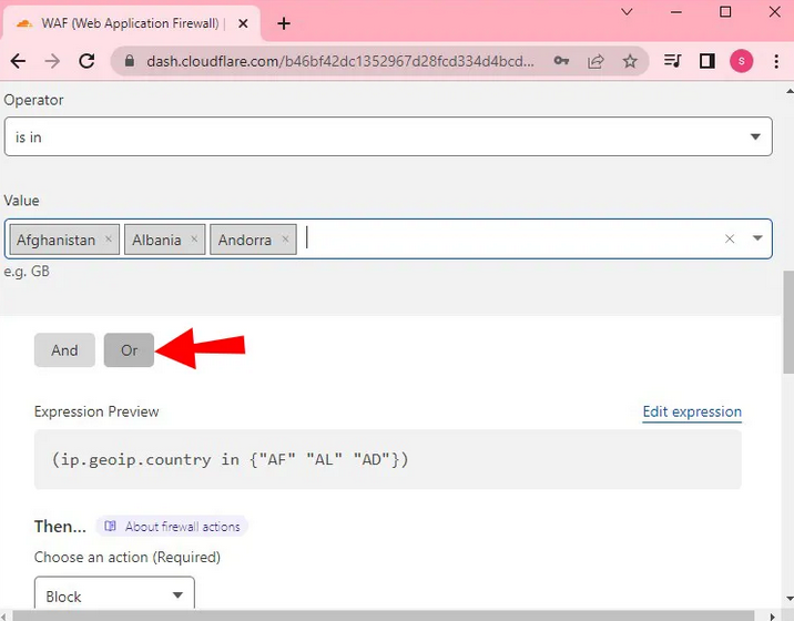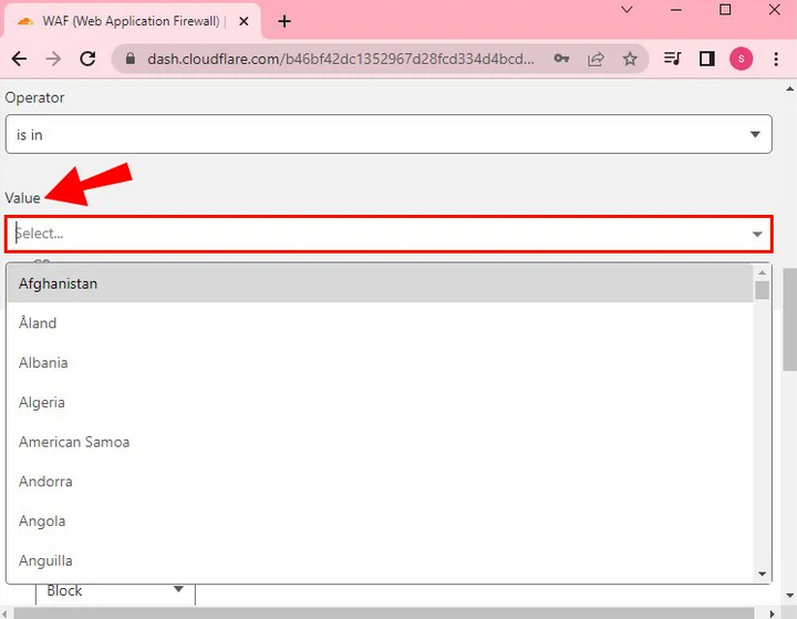 - In "Value" choose which countries you want to block.