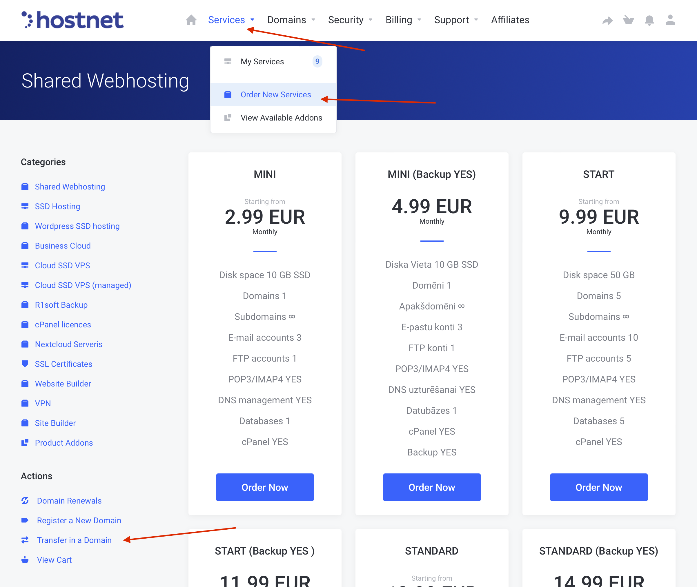 - In the section Services -> Order New Services select Transfer in a Domain.